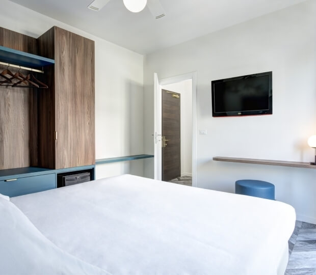 Room facilities: Double bed and a bunk sofa bed, Air conditioning/heating, safe, desk, Wi-Fi, telephone, LCD satellite TV and Sky TV, shower, hair-dryer, bathroom kit, side balcony.
