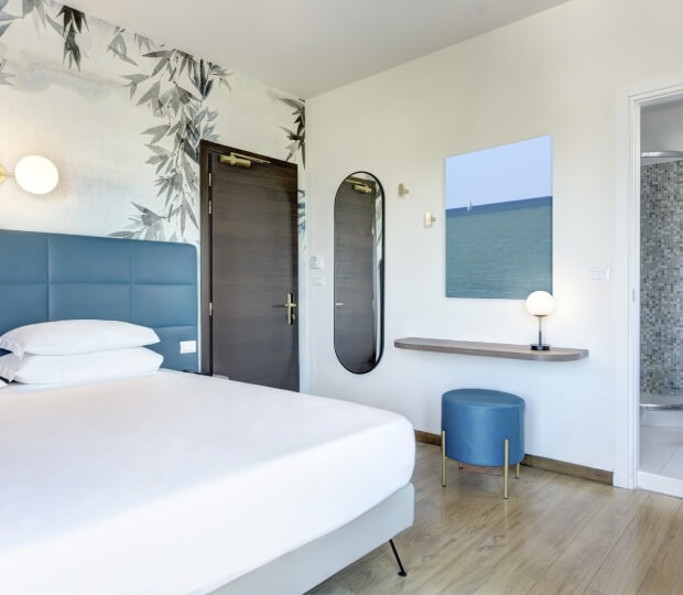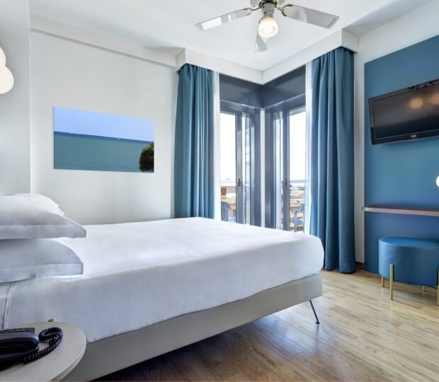 These rooms consist of a double bed or two singles. From the side window you can access the equipped balcony, which offers a side view of the sea of Jesolo.